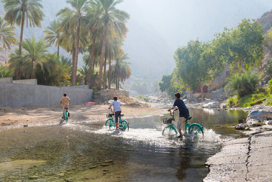 Kids on bicycles crossing the river near the Al Thowarah hot spring (Nakhal spring), Sultanate of Oman, Arabian Peninsula