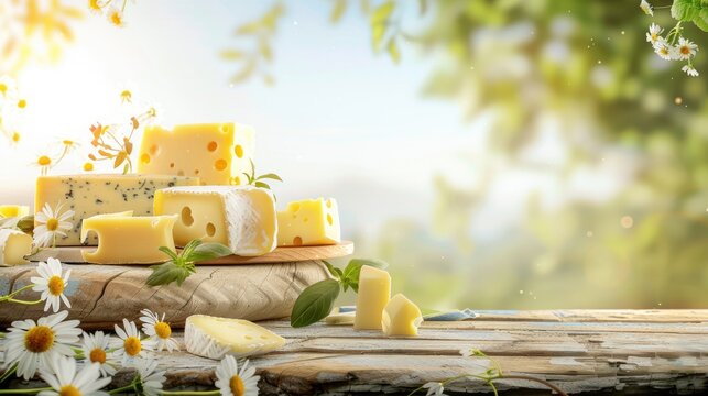 Cheese display in a spring scene with space for label