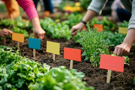 Gardeners nurturing seedlings and placing vibrant labels in rich, fertile soil, fostering growth and cultivating a thriving community garden