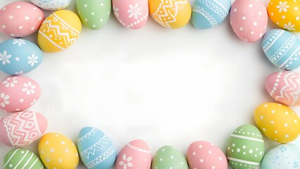 Decorated Easter eggs forming a border on a white background. Flat lay holiday mockup with copy space