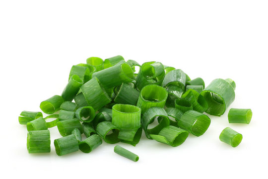 Chopped spring onions and parsley resting on rustic wooden cutting board