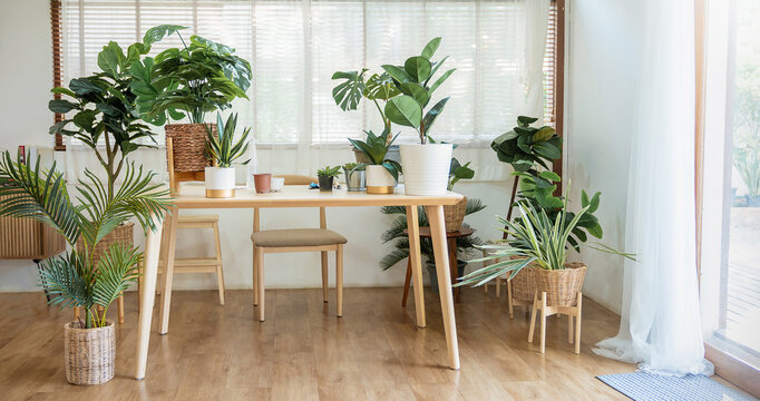 Photo of stylish minimal room interior with different home plants. Botanic style in living room with a table and chair. Green spring theme concept