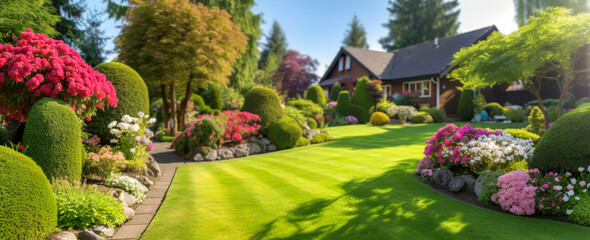Landscape design with flower beds in home garden, beautiful landscaping in residential house backyard. Scenic view of beautiful landscaped garden, scenery of luxury backyard in summer. Nature theme.
