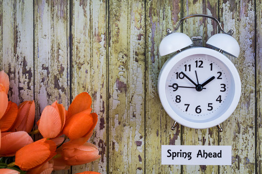 Daylight Savings Time Spring Ahead concept top down view with white clock and orange tulips