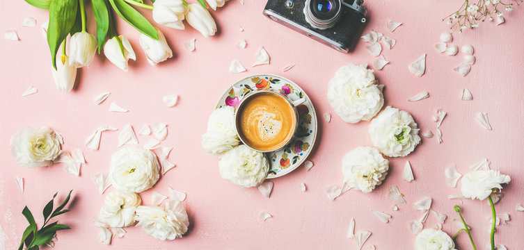White coffee cup and open book with spring flowers on a wooden table, embracing spring vibes
