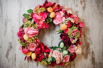 Beautiful spring composition of the big wreath of pink flowers decorated with little toy eggs