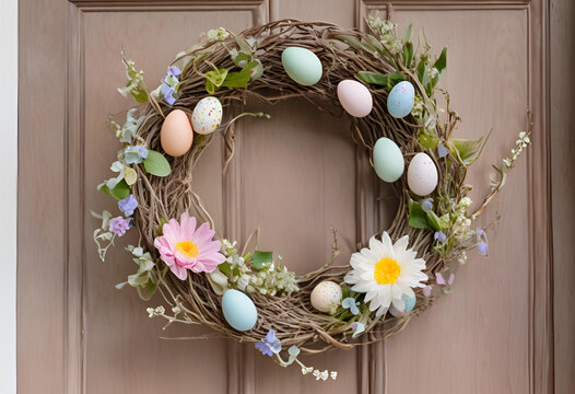 wreath of flowers and easter door decoration