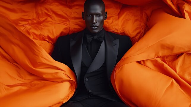 Man in black tuxedo, orange backdrop
