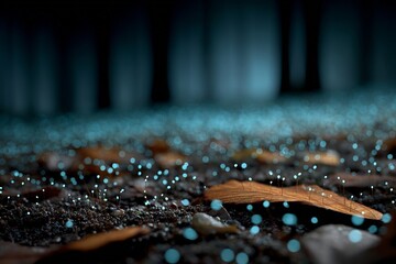 Forest undergrowth glowing faintly bioluminescent springtails in leaf litter highly realistic low light close up of micro fauna ecosystem