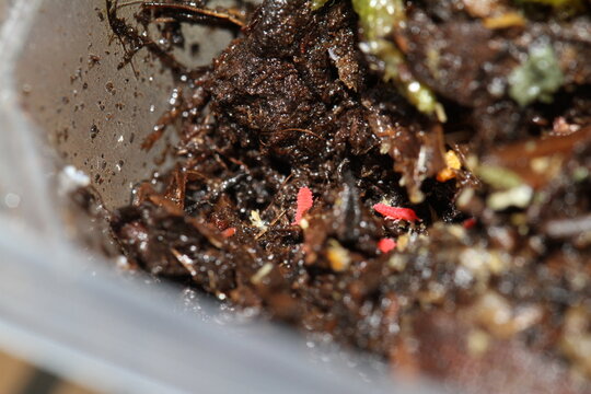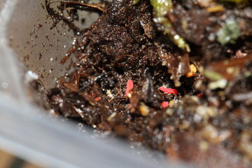 Macro close-up showing translucent microarthropods crawling through damp potting mix with root hairs
