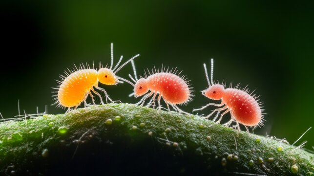 Springtails (Collembola: Entomobryomorpha) on an orange leaf. Extreme close-up with high magnification