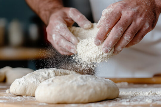 Baker kneading dough with flour-dusted hands on rustic table