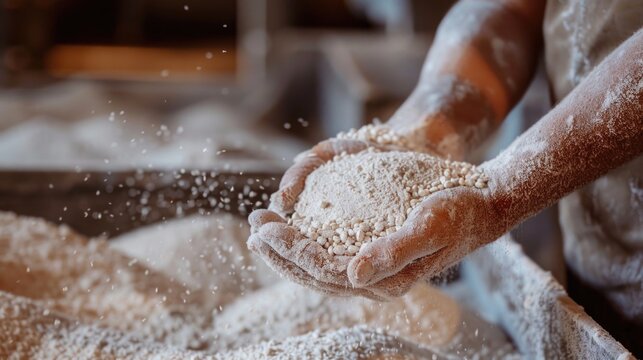 Cook pouring wheat white flour, hands close-up, copy place for text.