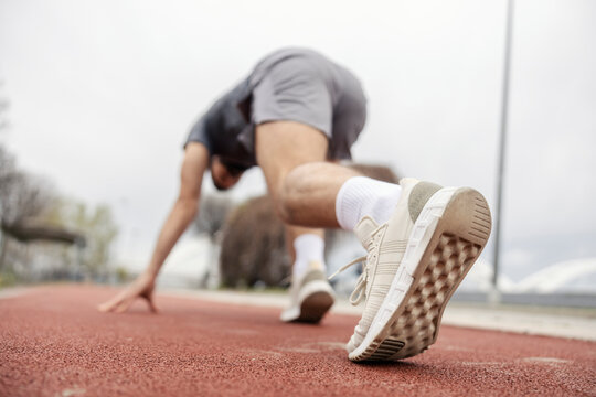 Athlete in starting position on running track, wearing light blue athletic shoes and white leggings, preparation and determination before race