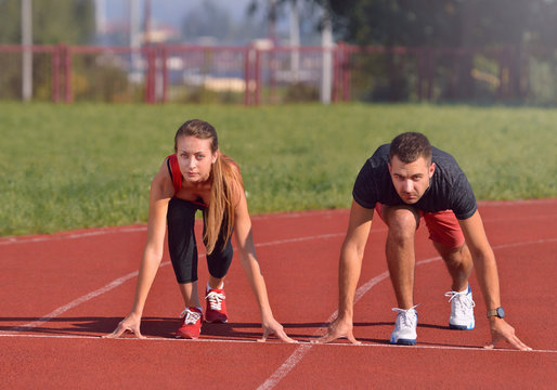 Young sport couple in starting position prepared to compete and run