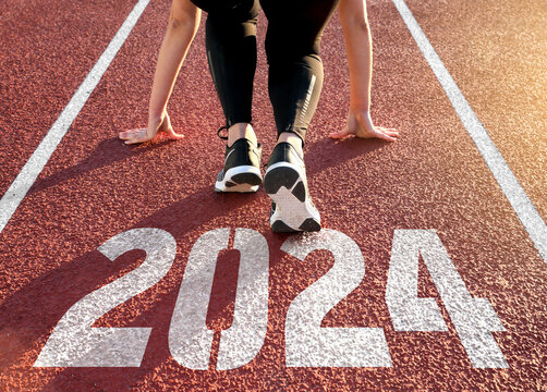 Rear view of a woman preparing to start on an athletics track engraved with the year 2024