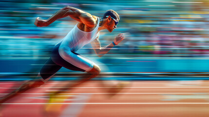 Speeding athlete on a sprint track showcasing motion and determination in a dynamic blur of movement