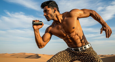 A majestic white horse gallops through swirling sand, dramatic backdrop