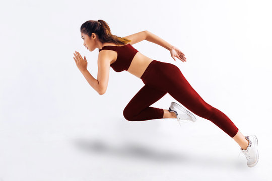 Side view of slim Asian female in red sportswear sprinting fast during workout against white background