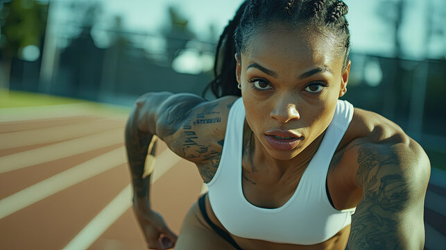 A focused athlete sprinting on a track, showcasing determination and strength.