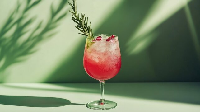 Pomegranate spritzer cocktail garnished with rosemary on a vibrant green background with soft shadows