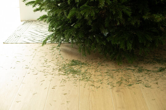 Fallen spruce needles on the floor, trash from dried Christmas tree
