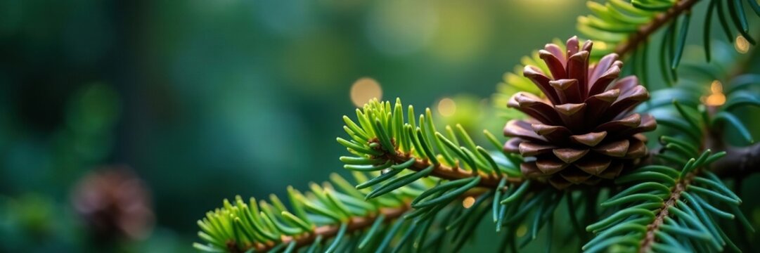 Close-up conifer branch with soft bokeh lighting, moody evergreen needles and natural texture