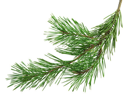 Evergreen pine branch stretching across light wood tabletop flatlay with natural needles