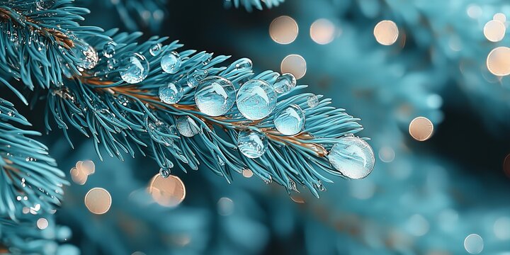 Blue Christmas Tree Branch with Dew Drops and Bokeh Lights Festive Background