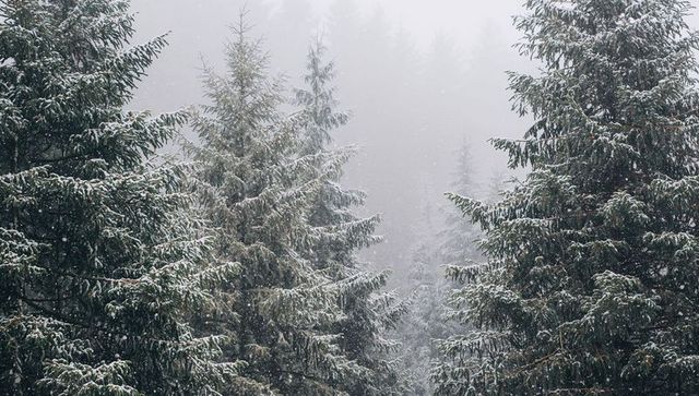 Snow-dusted fir and spruce forest fading into misty fog, layered winter conifer landscape