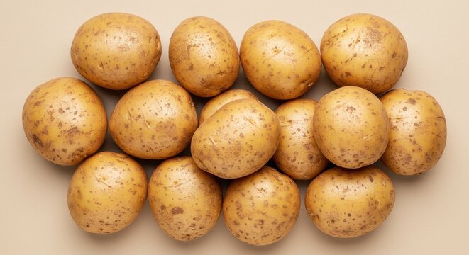 Overhead view of pile of fresh brown potatoes on beige surface