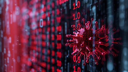 A menacing red-colored computer virus that infiltrates the binary program code consisting of zeros and ones, disrupting digital systems and compromising data security