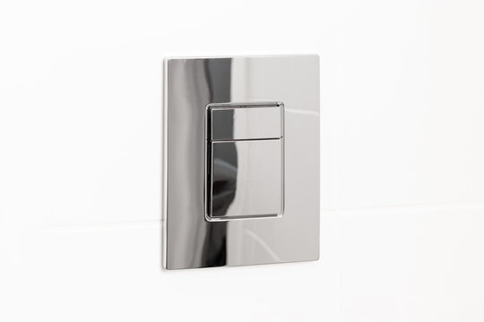 Metal chromed toilet flush button on white tile wall. Details in a bright modern bathroom