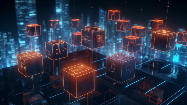 Futuristic Blockchain Network Visualization with Interconnected Digital Data Blocks Floating in a Cybernetic Smart City Environment