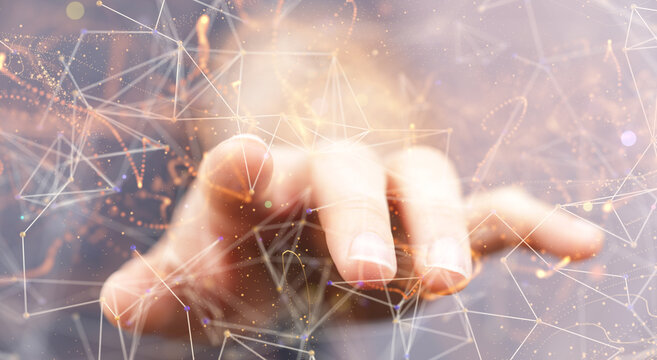 Abstract digital network grid with glowing geometric shapes and data points technology