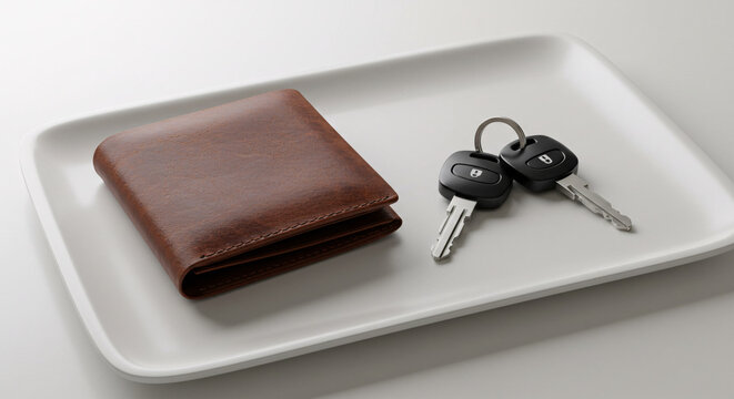 A brown leather wallet and a set of car keys resting on a white square serving tray surface top view