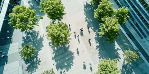 An ariel view of people walking through or using a plaza or square in a city center or university complex