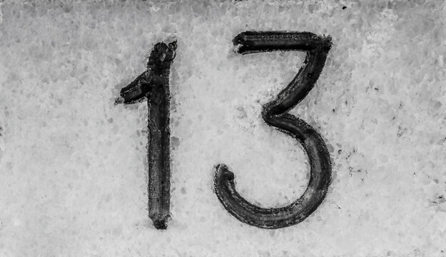 Close up outdoor view of number thirteen 13 written in white on a black and white square plate. Numerical sign fixed at a house exterior wall to indicate the address in street. Vintage design image