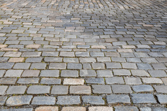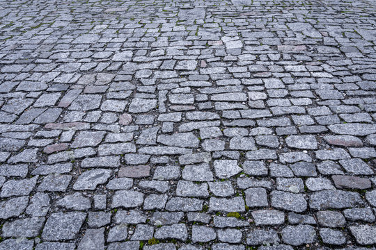 View of granite cobblestoned pavement background. Full frame of irregular cobbled street. Natural stone textured background