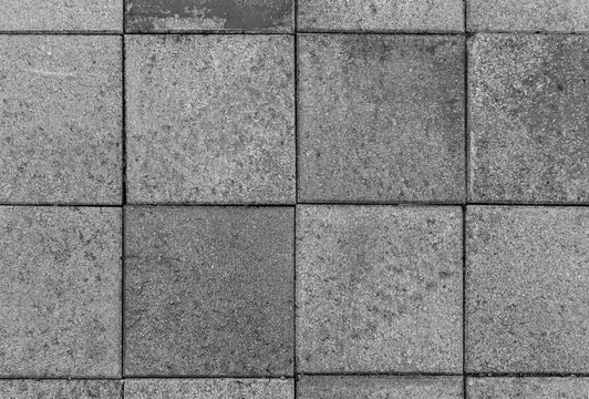 Close-up of a bit dirty and weathered square paving stones or blocks outdoors viewed from above in black and white. High resolution full frame textured background.
