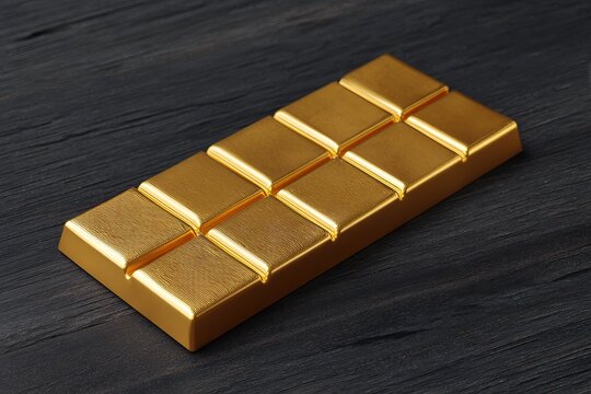 Golden Chocolate Bar on Dark Wood Surface, Close-Up.