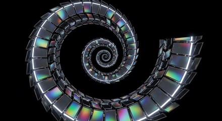 Infinite spiral made of reflective square tiles on black background