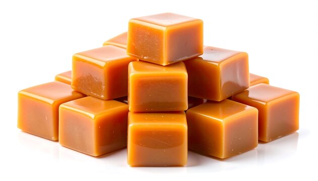Caramel squares pyramid on white background