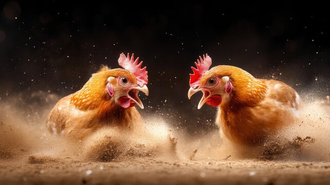 Two fierce chickens battle in a dramatic showdown, throwing up clouds of dust as they squawk loudly, showcasing their vibrant plumage and energetic display of dominance.