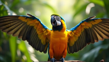 SQUAWK – Scarlet macaw in jungle canopy; vibrant wingbeats scattering into multicolored tribal block letters