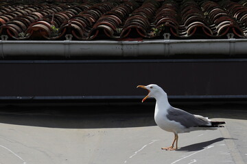 Headshot of a white seagull bird with yellow beak wide open, loudly squawking