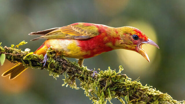 A Bluejay Bird with Its Beak Wide Open Squawking While Looking Over the Horizon from a Cherry Tree on a Summer Day with Bright Blue Sky - a Series