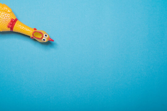 Shrilling Chicken squeaky toy . toy rubber shriek yellow chicken isolated on blue background