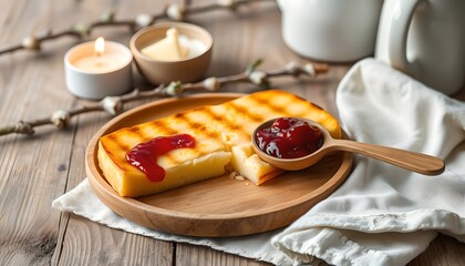 Traditional Finnish squeaky cheese known as leipäjuusto served warm with red berry jam on a wooden plate.