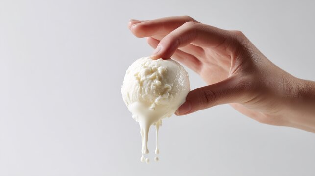 Close up of hand squeezing fresh mozzarella ball with dripping cheese